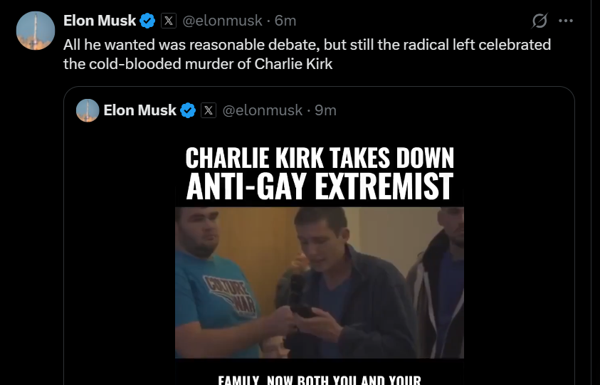 Në një postim të pak minutave më vonë, Musk shkruan se Kirk donte vetëm debat të arsyeshëm me këdo, po pavarësisht kësaj e majtra radikale festoi vrasjen me gjaktftohtësi të Kirk.