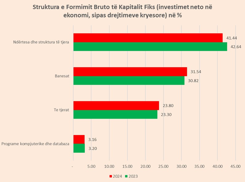 Formimi Bruto i Kapitalit Fiks (FBKF), mat investimin neto që një ekonomi bën për të ndërtuar kapacitete të reja prodhuese ose për të përmirësuar ato ekzistuese. Gjatë vitit të kaluar 31.5 për qind e investimeve neto në të gjithë ekonominë shkuan në banesa, duke u rritur nga niveli 30.8% i vitit 2023.