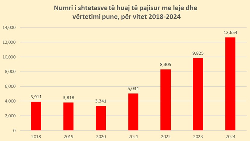 Për 2024, sipas të dhënave të Agjencisë Kombëtare e Punësimit dhe Aftësive (AKPA) janë miratuar online 12,654 kërkesa nga shtetas të huaj për t’u pajisur me Leje Unike që përfshin leje për punësim + vizë + leje qëndrimi. Krahasuar me vitin paraardhës numri i tyre u rrit rreth 29%. Ndërsa në raport me 2018 numri i tyre është trefishuar.