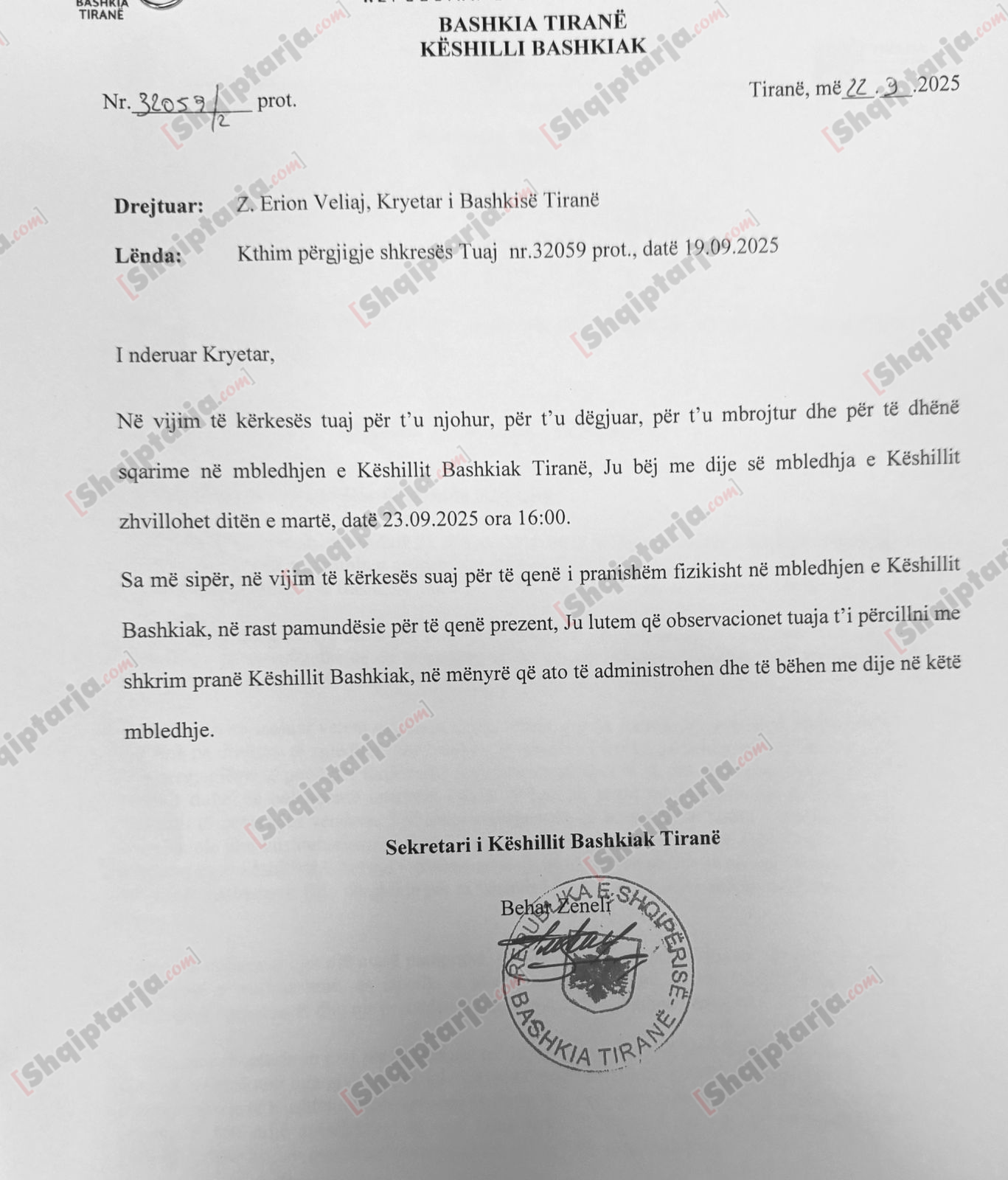 “Sa më sipër, në vijim të kërkesës suaj për të qenë i pranishëm fizikisht në mbledhjen e Këshillit Bashkiak, në rast pamundësie për të qenë prezent, Ju lutem që observacionet tuaja t’i përcilini me shkrim pranë Këshillit Bashkiak, në mënyrë që ato të administrohen dhe të bëhen me dije në këtë mbledhje”, thuhet në letrën dërguar Veliajt.