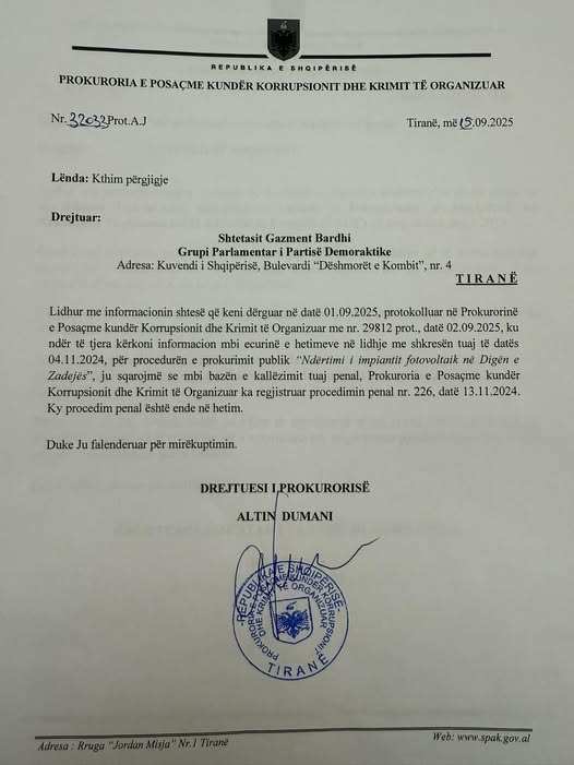 Kryetari i grupit parlamentar të PD Gazment Bardhi kapublikuar shkresën e SPAK, sipas së cilës, impianti fotovoltatik në Digën e Zadejës me vlerë 8 milionë euro është një aferë korruptive për të cilën ai ka bërë kallëzim penal dhe SPAK ka regjistruar zyrtarisht procedimin penal.