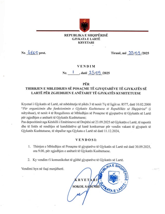 Mbledhja do të zhvillohet më 30 shtator 2025, ora 09:00, pranë ambientëve të Gjykatës së Lartë, me qëllim zgjedhjen e anëtarit të ri të Gjykatës Kushtetuese.