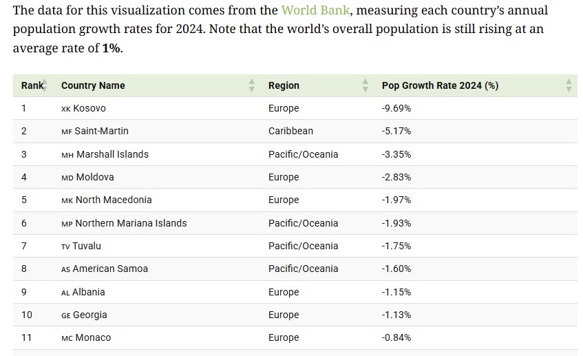 Ndërkohë, Kosova kryeson listën botërore për rënien më të fortë të popullsisë, me një tkurrje rekord prej -9.69% në vitin 2024. Emigracioni masiv, sidomos i të rinjve drejt vendeve të Bashkimit Europian, po e kthen këtë fenomen në një sfidë serioze demografike dhe ekonomike për vendin.