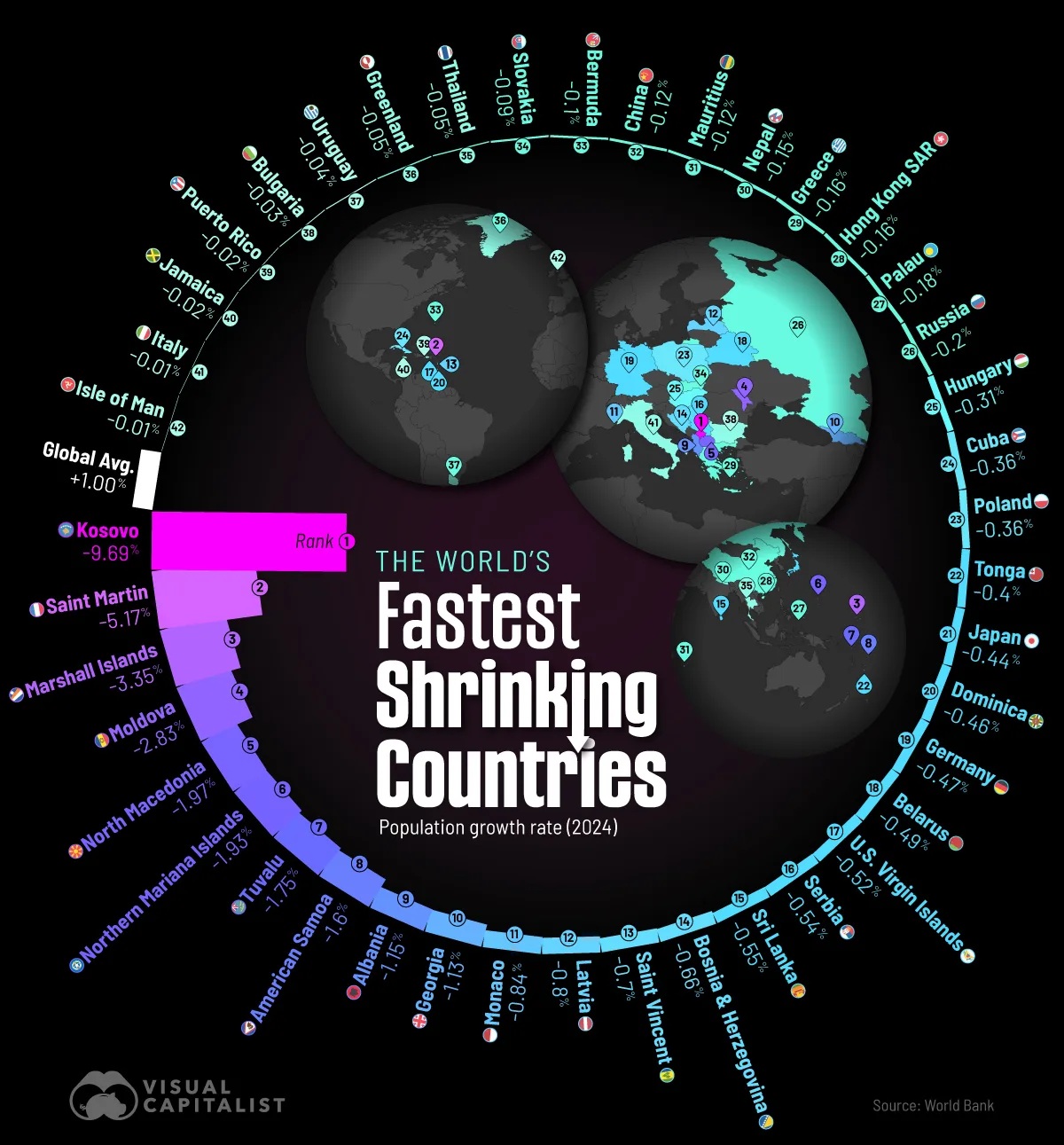 Sipas të dhënave të Bankës Botërore, 42 vende dhe territore po tkurren aktualisht, me disa prej tyre që përjetojnë rënie më të shpejta se të tjerat. Në këtë infografikë, paraqiten zonat ku po ndodhin tkurrjet më të shpejta, sipas të dhënave të vitit 2024.