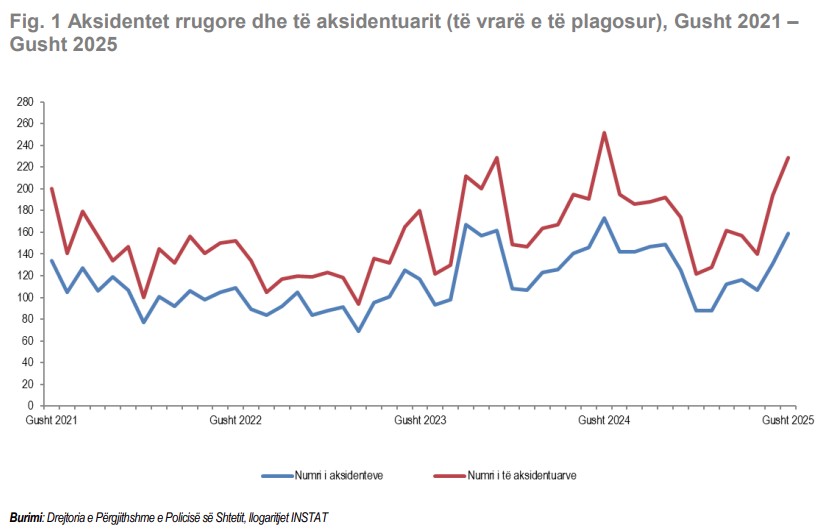 “Në muajin Gusht 2025 numërohen 159 aksidente rrugore, nga të cilët 229 persona janë të aksidentuar (të vrarë dhe të plagosur). * (Të dhënat e publikuara janë paraprake dhe subjekt përditësimi).