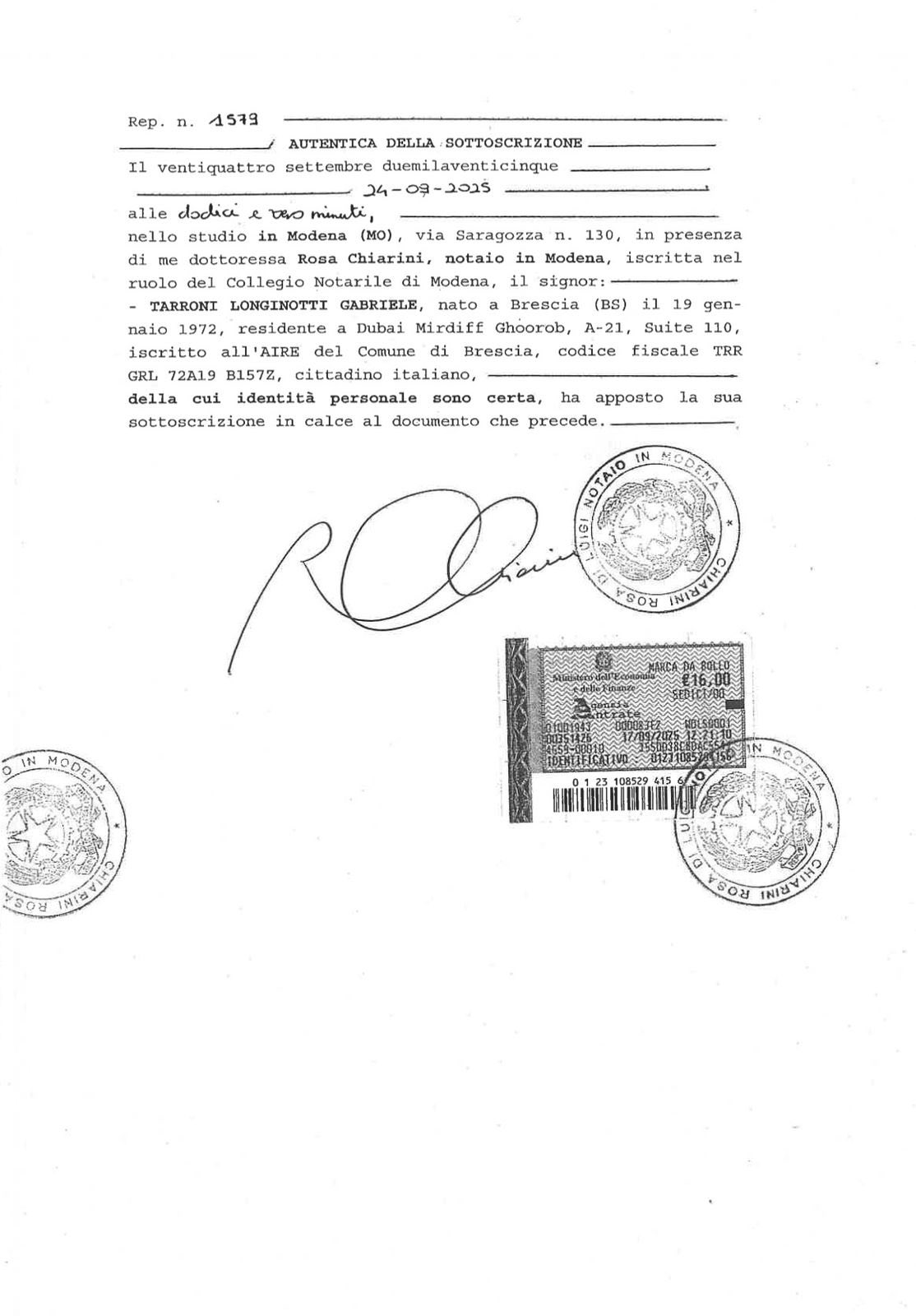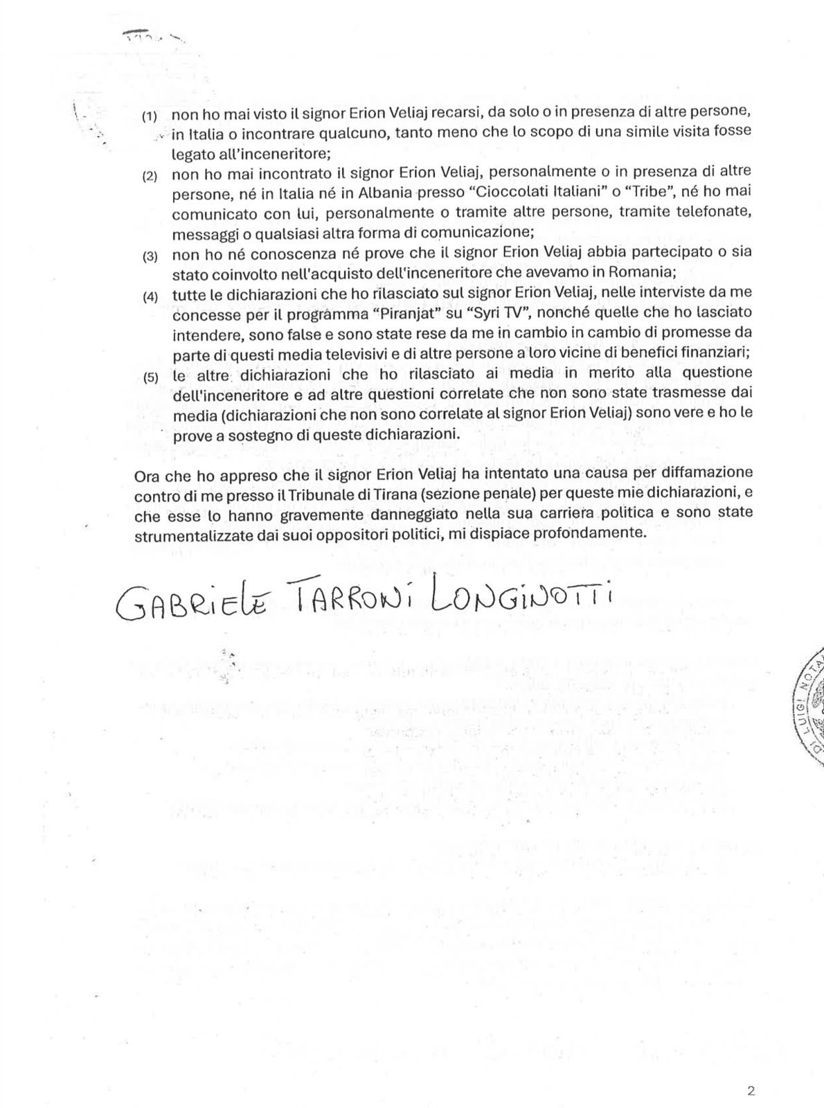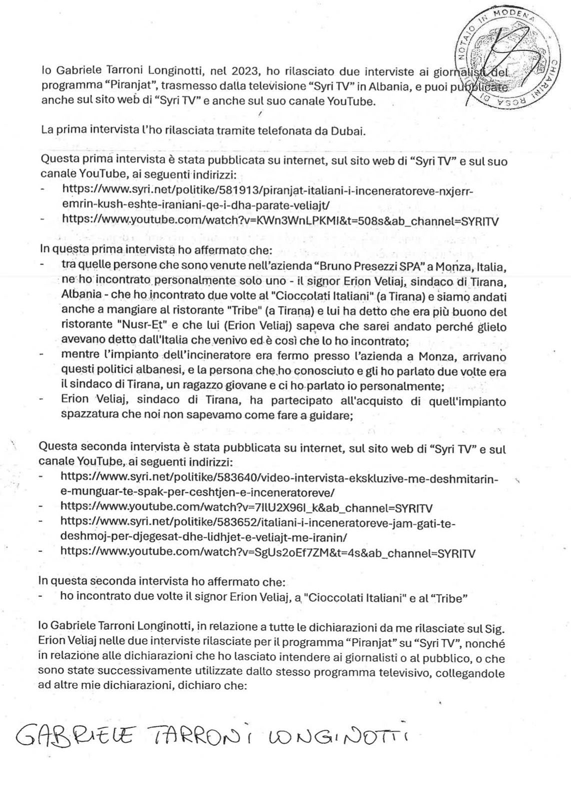Ai publikoi pjesë nga një deklaratë noteriale të Gabriele Tarroni Longinotti-t, i cili tërheq dëshmitë e dhëna më herët dhe i cilëson ato si të pavërteta, të bëra në këmbim të përfitimeve financiare.