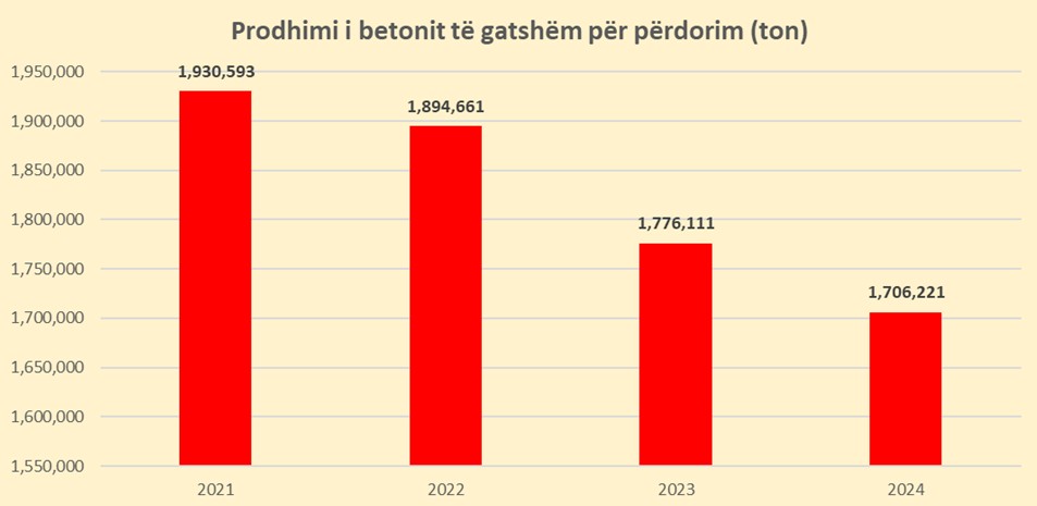 Prodhimi i betonit të gatshëm ka ndjekur një tendencë zbritëse: nga 1.93 milionë tonë në vitin 2021, ra në 1.77 milionë tonë në vitin 2023 dhe më tej në 1.70 milionë tonë në vitin 2024. Ky zhvillim reflekton një ulje të kërkesës së brendshme për beton, e cila lidhet drejtpërdrejt me ngadalësimin e aktivitetit të ndërtimit në vend.