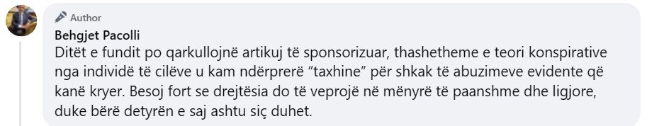 Në një koment poshtë statusit të tij, Pacolli, thekson se ditët e fundit në media po qarkullojnë shkrime të sponsorizuara, thashetheme e teori konspirative nga persona që baca Behgjet thotë se u ka ndërprerë “tagjinë” për shkak të abuzimeve.