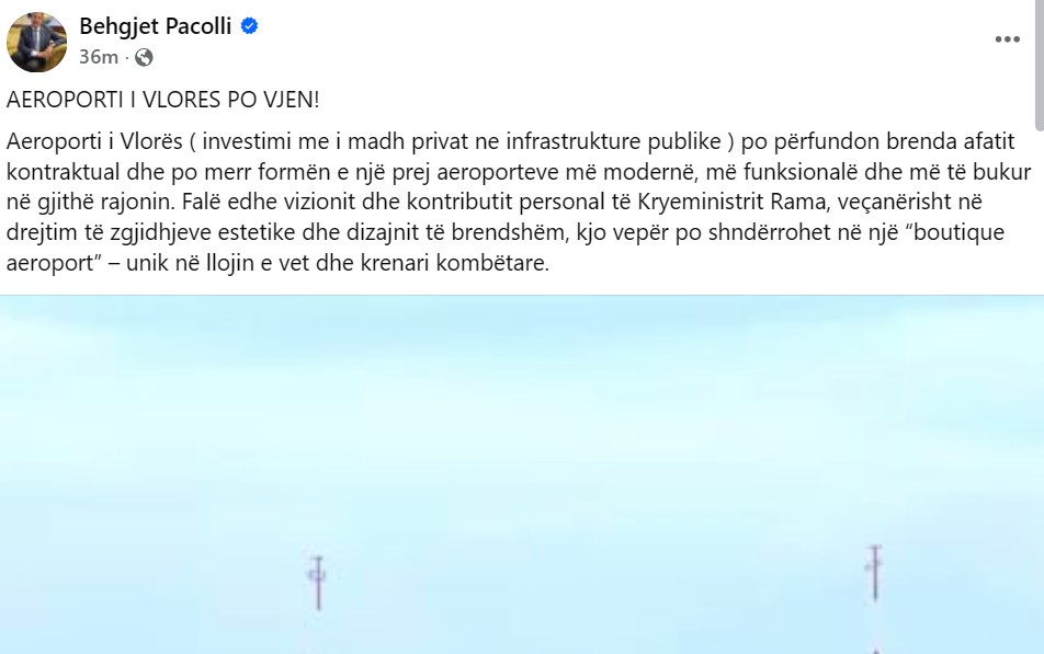 “AEROPORTI I VLORES PO VJEN! Aeroporti i Vlorës ( investimi me i madh privat ne infrastrukture publike ) po përfundon brenda afatit kontraktual dhe po merr formën e një prej aeroporteve më modernë, më funksionalë dhe më të bukur në gjithë rajonin. Falë edhe vizionit dhe kontributit personal të Kryeministrit Rama, veçanërisht në drejtim të zgjidhjeve estetike dhe dizajnit të brendshëm, kjo vepër po shndërrohet në një “boutique aeroport” – unik në llojin e vet dhe krenari kombëtare.” – shkruan Pacolli.