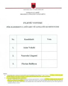 Gjykata sqaron se, pas votimit, në mungesë të shumicës prej 3/5, në përputhje me ligjin, anëtar i Gjykatës Kushtetuese u shpall Asim Vokshi, i renditur i pari nga Këshilli i Emërimeve në Drejtësi.