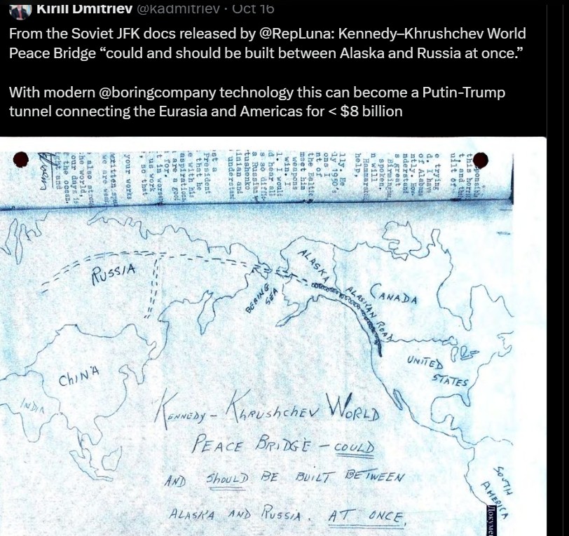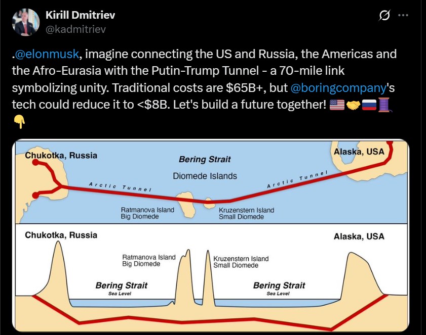 “Përfytyroni të lidhni SHBA-në dhe Rusinë, Amerikat dhe Afro-Eurazinë me tunelin Putin-Trump, një lidhje 112 kilometrash që simbolizon unitetin”, tha në X Kirill Dmitriev, drejtor ekzekutiv i fondit sovran të pasurisë së Kremlinit dhe një i dërguar special për investime.