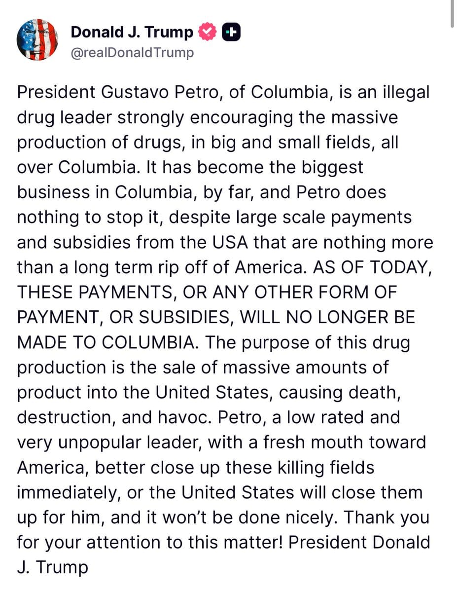 “Presidenti Gustavo Petro, i Kolumbisë, është një udhëheqës i drogës i paligjshme që nxit fuqishëm prodhimin masiv të drogës, në fusha të mëdha dhe të vogla, në të gjithë Kolumbinë. Ky është bërë biznesi më i madh në Kolumbi, padyshim, dhe Petro nuk bën asgjë për ta ndaluar, pavarësisht pagesave dhe subvencioneve në shkallë të gjerë nga SHBA-ja që nuk janë gjë tjetër veçse një mashtrim afatgjatë i Amerikës. DUKE FILLUAR NGA SOT, KËTO PAGESA, APO ÇDO FORMË TJETËR PAGESE, OSE SUBVENCIONIM, NUK DO T’I BËHEN MË KOLUMBISË. Qëllimi i këtij prodhimi droge është shitja e sasive masive të produktit në Shtetet e Bashkuara, duke shkaktuar vdekje, shkatërrim dhe kaos. Petro, një udhëheqës me vlerësime të ulëta dhe shumë i papëlqyer, me një gojë të freskët ndaj Amerikës, bën mirë t’i mbyllë këto fusha vrasëse menjëherë, ose Shtetet e Bashkuara do t’i mbyllin ato për të, dhe kjo nuk do të bëhet me mirësjellje. Faleminderit për vëmendjen tuaj ndaj kësaj çështjeje! Presidenti Donald J. Trump” – shkruan Trump.