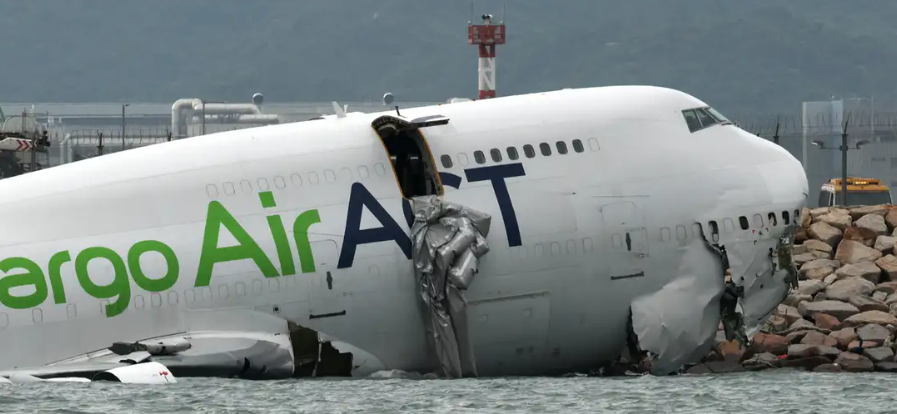 Një aeroplan mallrash që fluturonte nga Dubai rrëshqiti nga pista në det gjatë uljes në Aeroportin Ndërkombëtar të Hong Kongut , tha të hënën operatori i aeroportit të qytetit, duke vrarë dy persona në tokë.