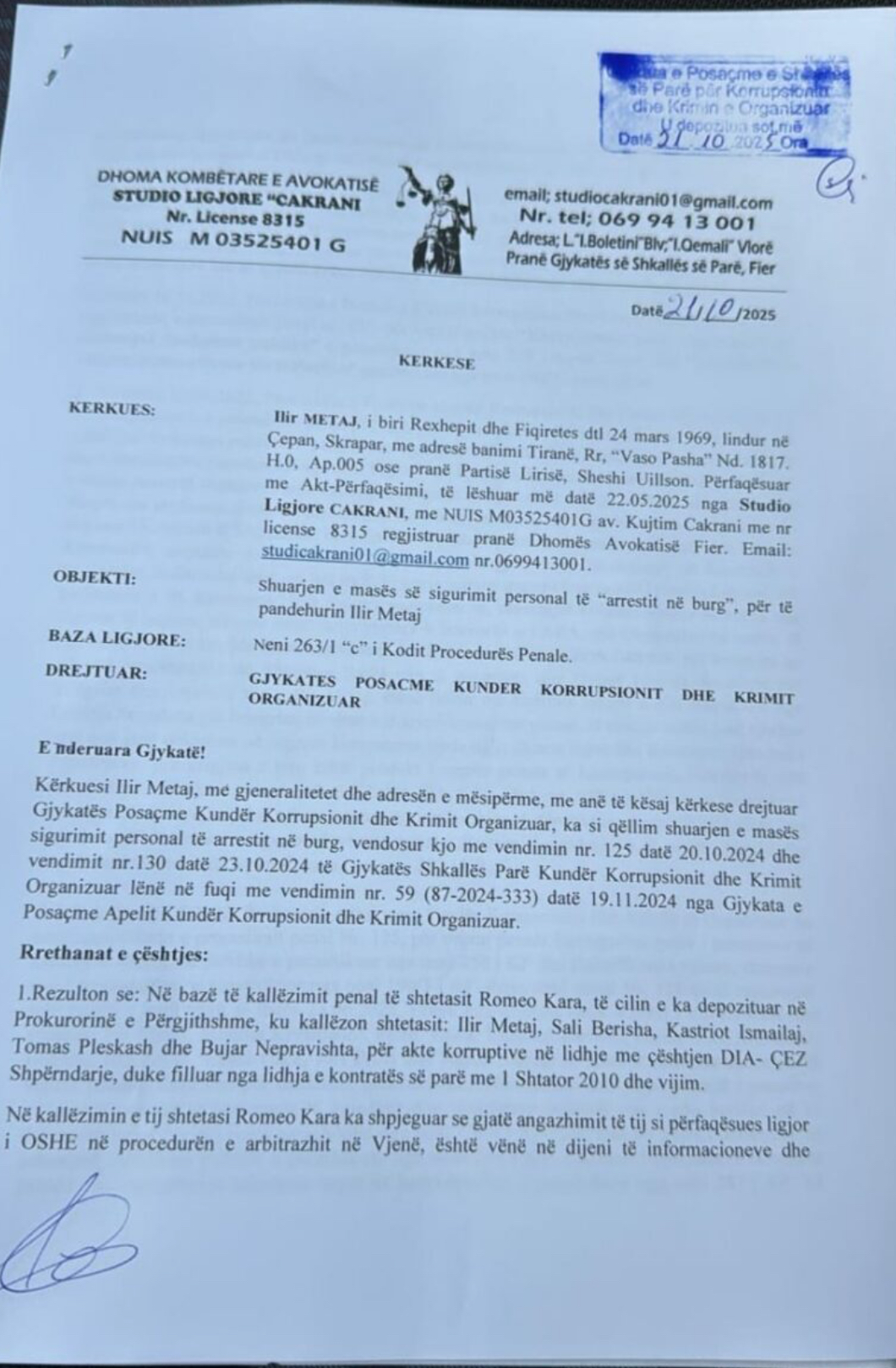 Në kërkesën e tij, Meta thekson se ka për qëllim shuarjen e masës së arrestit në burg, të vendosur më 20 dhe 23 tetor 2024 nga Gjykata e Shkallës së Parë Kundër Korrupsionit dhe Krimit Organizuar dhe lënë në fuqi më 19 nëntor 2024 nga Gjykata e Posaçme e Apelit Kundër Korrupsionit dhe Krimit Organizuar.