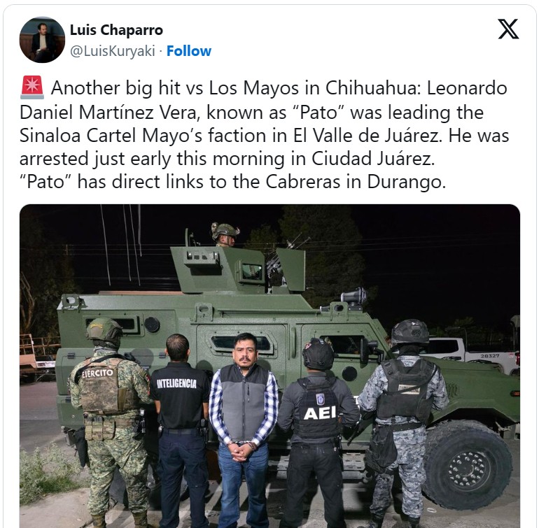Zyra e Drejtorit të Inteligjencës Kombëtare (ODNI), të cilën e drejton Gabbard, njoftoi të martën arrestimin e bosit të “Plaza”-s së Kartelit Sinaloa, Leonardo Daniel Martinez Vera, i cili njihet gjithashtu si “El Pato”, në Juarez, Meksikë, më 15 tetor 2025.