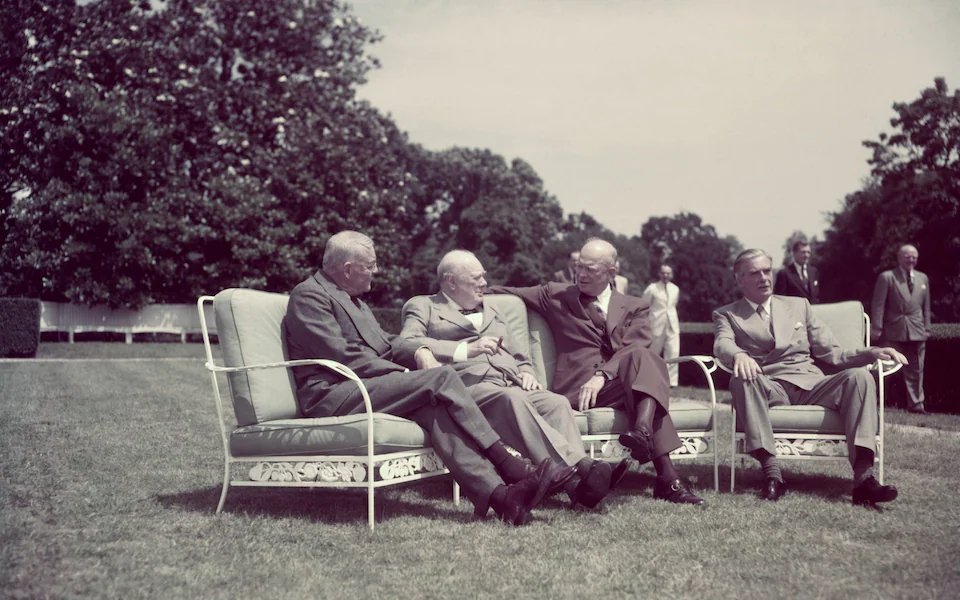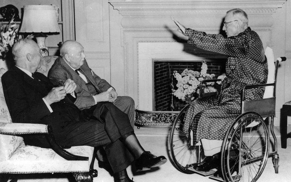 Churchill gëzonte marrëdhënie të mira me amerikanët – shihet këtu me Presidentin Eisenhower dhe Allan Dulles, kreun e CIA-s