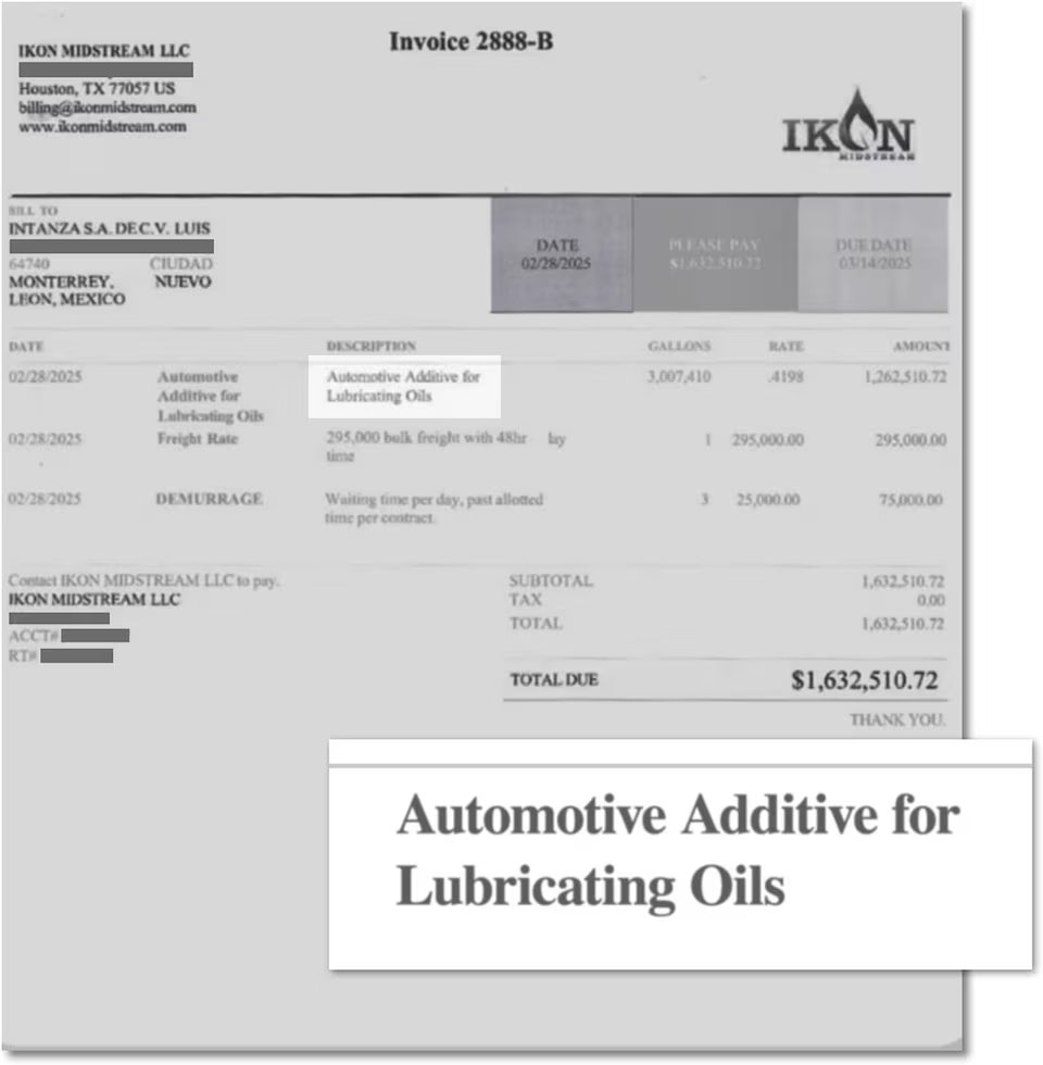 Faturë e Ikon Midstream e datës 28 Shkurt 2025, për ngarkesën në bordin e cisternës Torm Agnes. Dokumenti e liston dërgesën si një lubrifikant. Burime të njohura me transaksionin i thanë Reuters se anija transportonte naftë