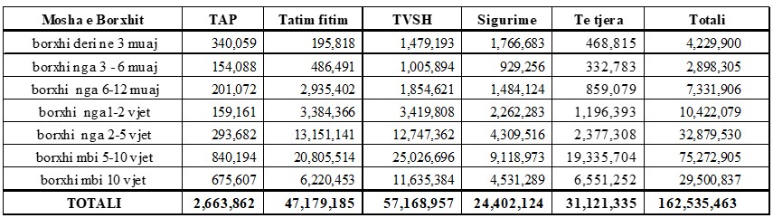 Borxhi mbi 10 vite përbën 18% të totalit në shumën e 29,5 mld lekëve. Borxhi i papaguar nga 5 deri në 10 vjet zë 46% të totalit dhe llogaritet në shumën e 75,2 mld lekëve. Borxhet e papaguara nga 2 deri në 5 vjet janë në shumën e 32,8 mld lekë (ose 20%), 1 deri në 2 vjet në shumën 10,4 mld lekë (ose 6 %), 6 deri në 12 muaj në shumën 7,3 mld lekë (ose 5 %), 3 deri në 6 muaj në shumën 2,8 mld lekë (ose 2 %), deri në 3 muaj në shumën 4,2 mld lekë (ose 3 %).