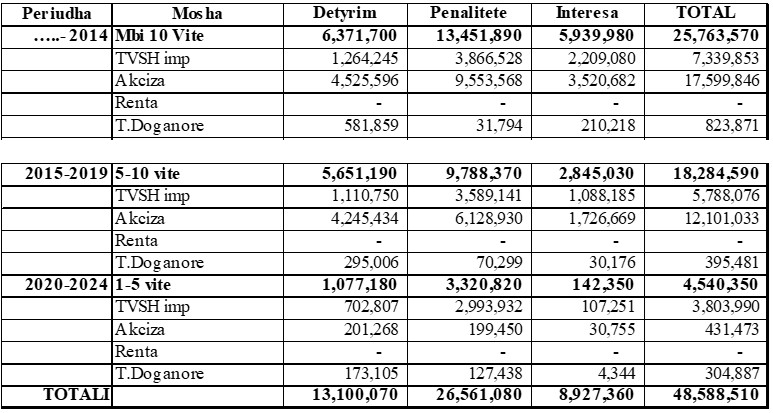 Sipas vjetërsisë detyrimet doganore të papaguara mbi 10 vjet janë në shumën 25,7 mld lekë, 5 deri në 10 vjet në shumën 18,2 mld lekë, 1 deri në 5 vjet në shumën 4,5 mld lekë.