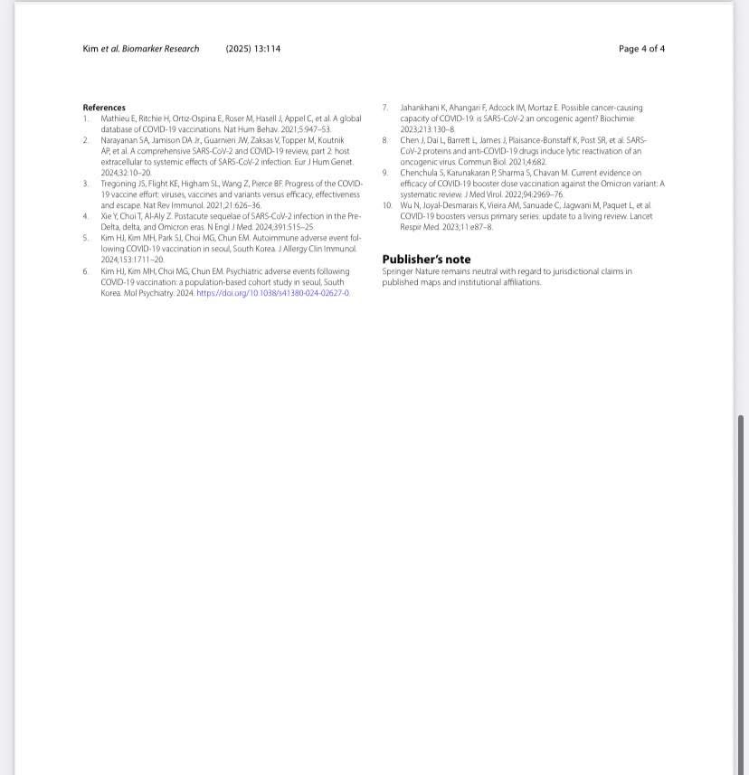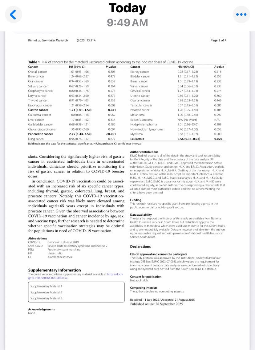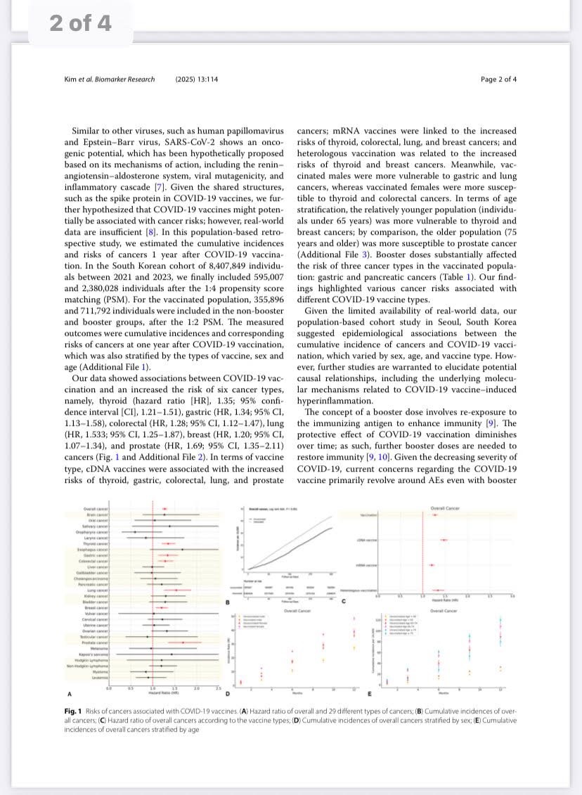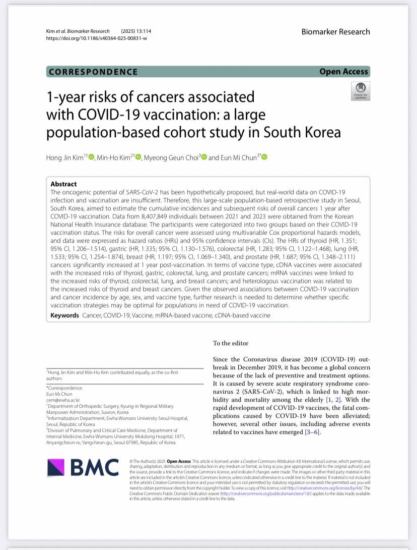 Studimi më i fundit nga prof. Kim et al., i kryer në një popullatë prej më shumë se 8 milionë njerëzish në Korenë e Jugut, një nga vendet e para të vaksinuara në botë me vaksinat gjenetike kundër Covid-19, evidenton një rritje prej të paktën 50% të tumoreve te individët e vaksinuar, krahasuar me të pavaksinuarit.