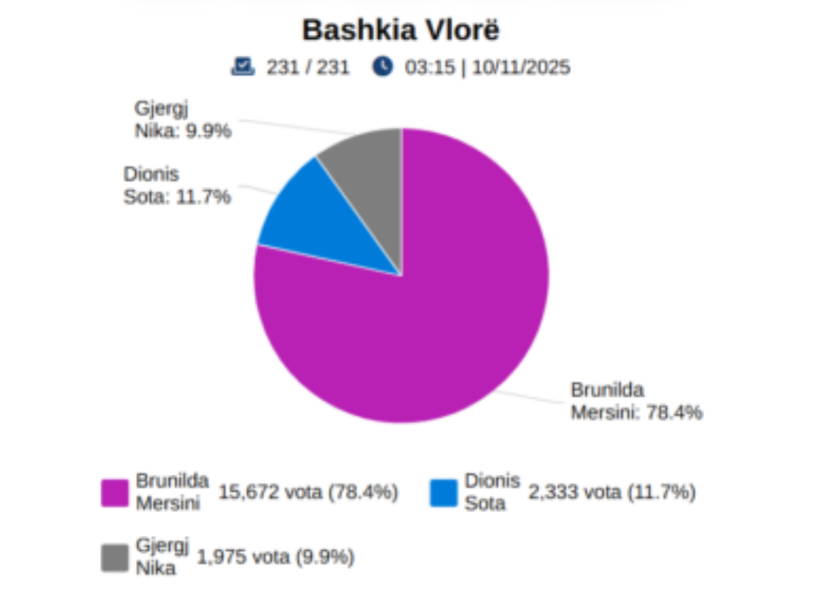 Pas numërimit të 231 kutive në Bashkinë e Vlorës, kandidatja e Partisë Socialiste, Brunilda Mersini, ka siguruar një fitore të thellë me 78.4% të votave, duke marrë 15,672 vota.
