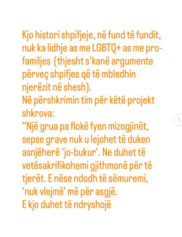 “Kjo histori shpifjeje, në fund të fundit, nuk ka lidhje as me LGBTQ+ as me pro-familjes. (Thjesht s’kanë argumente përveç shpifjes që të mbledhin njerëzit në shesh)”. Në përshkrimin tim për këtë projekt shkrova: “Një grua pa flokë fyen mizogjinët, sepse grave nuk u lejohet të duken asnjëherë ‘jo-bukur’. Ne duhet tyëe vetësakrifikohemi gjithmonë për të tjerët. E nëse ndodh të sëmuremi, ‘nuk vlejmë’ mër për asgjë. E kjo duhet të ndryshojë.” – shkruak Kambo në Instagram.