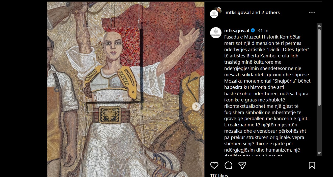 “Fasada e Muzeut Historik Kombëtar merr sot një dimension të ri përmes ndërhyrjes artistike “Dielli i Ditës Tjetër” të artistes Blerta Kambo, e cila lidh trashëgiminë kulturore me ndërgjegjësimin shëndetësor në një mesazh solidariteti, guximi dhe shprese. Mozaiku monumental “Shqipëria” bëhet hapësira ku historia dhe arti bashkëkohor ndërthuren, ndërsa figura ikonike e gruas me xhubletë rikontekstualizohet me një gjest të fuqishëm simbolik në mbështetje të grave që përballen me kancerin e gjirit. E realizuar me të njëjtën mjeshtëri mozaiku dhe e vendosur përkohësisht pa prekur strukturën origjinale, vepra shërben si një thirrje e qartë për ndërgjegjësim dhe humanizëm, një dedikim për 1 në 12 gra që diagnostikohen me këtë sëmundje.” – shkruhet në sqarimi e ministrisë në faqen e saj në Instagram.