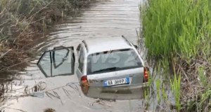 Si pasojë e goditjes së fortë, një nga makinat ka përfunduar e përmbysur në një kanal anës rrugës.