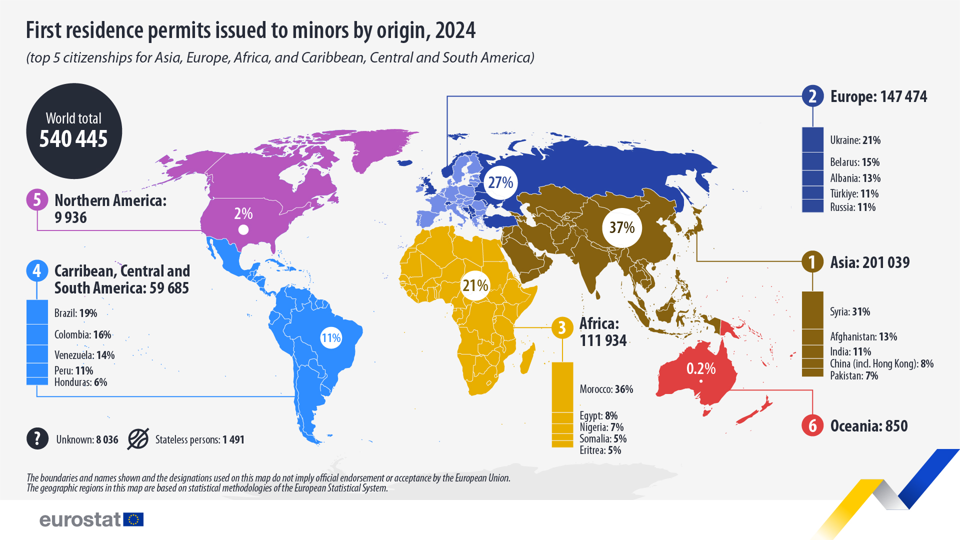 Në vitin 2024, vendet e BE-së lëshuan 540,445 leje të para qëndrimi për qytetarë jo-BE nën moshën 18 vjeç.