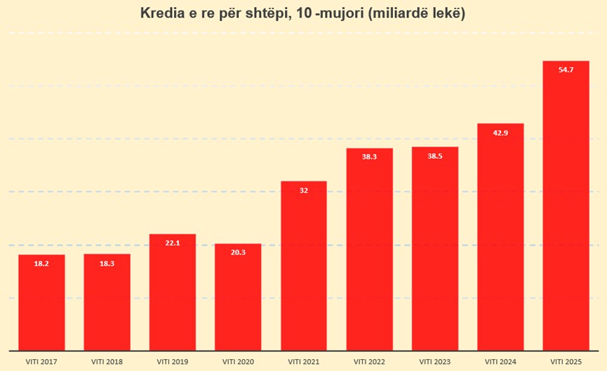 Në periudhën korrik-tetor, që përkon me hyrjen në fuqi të masave kufizuese të Bankës së Shqipërisë, kredia e re për shtëpi ka arritur në 18.5 miliardë lekë, në rritje me gati 23% krahasuar me të njëtën periudhë të vitit 2024.