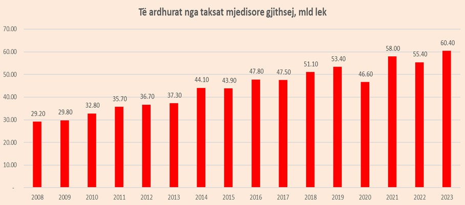 Sipas INSTAT në vitin 2023 të ardhurat nga taksa mjedisore arritën në 60.4 miliardë lekë ose rreth 620 milionë euro.