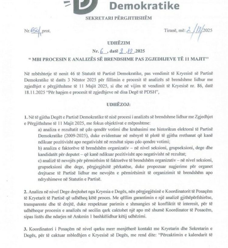 Procesi duhet të përmbyllet brenda datës 31 janar 2026, pas së cilës do mblidhet kryesia e partisë për të shqyrtuar të gjitha raportet e përgatitura nga koordinatorët e qarqeve.