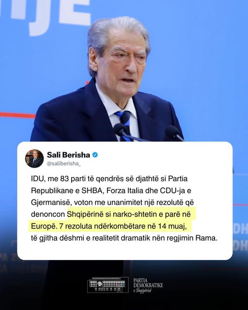 “IDU, me 83 parti të qendrës së djathtë si Partia Republikane e SHBA, Forza Italia dhe CDU-ja e Gjermanisë, voton me unanimitet një rezolutë që denoncon Shqipërinë si narko-shtetin e parë në Europë. 7 rezoluta ndërkombëtare në 14 muaj, të gjitha dëshmi e realitetit dramatik nën regjimin Rama.” – shkruan Berisha në Facebook.