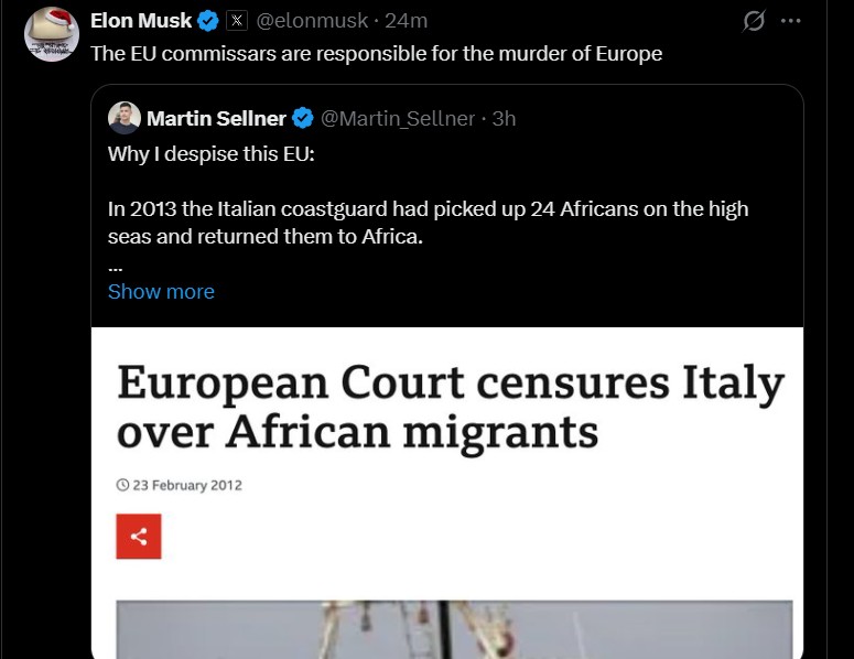 Në reagim, Musk ripostoi një mesazh ku shkruhej “Rajhu i Katërt”, i shoqëruar me një imazh ku flamuri i Bashkimit Evropian bashkohej me flamurin e Gjermanisë Naziste poshtë tij. Ai e shoqëroi ripostimin me komentin: “Mjaft e saktë”.