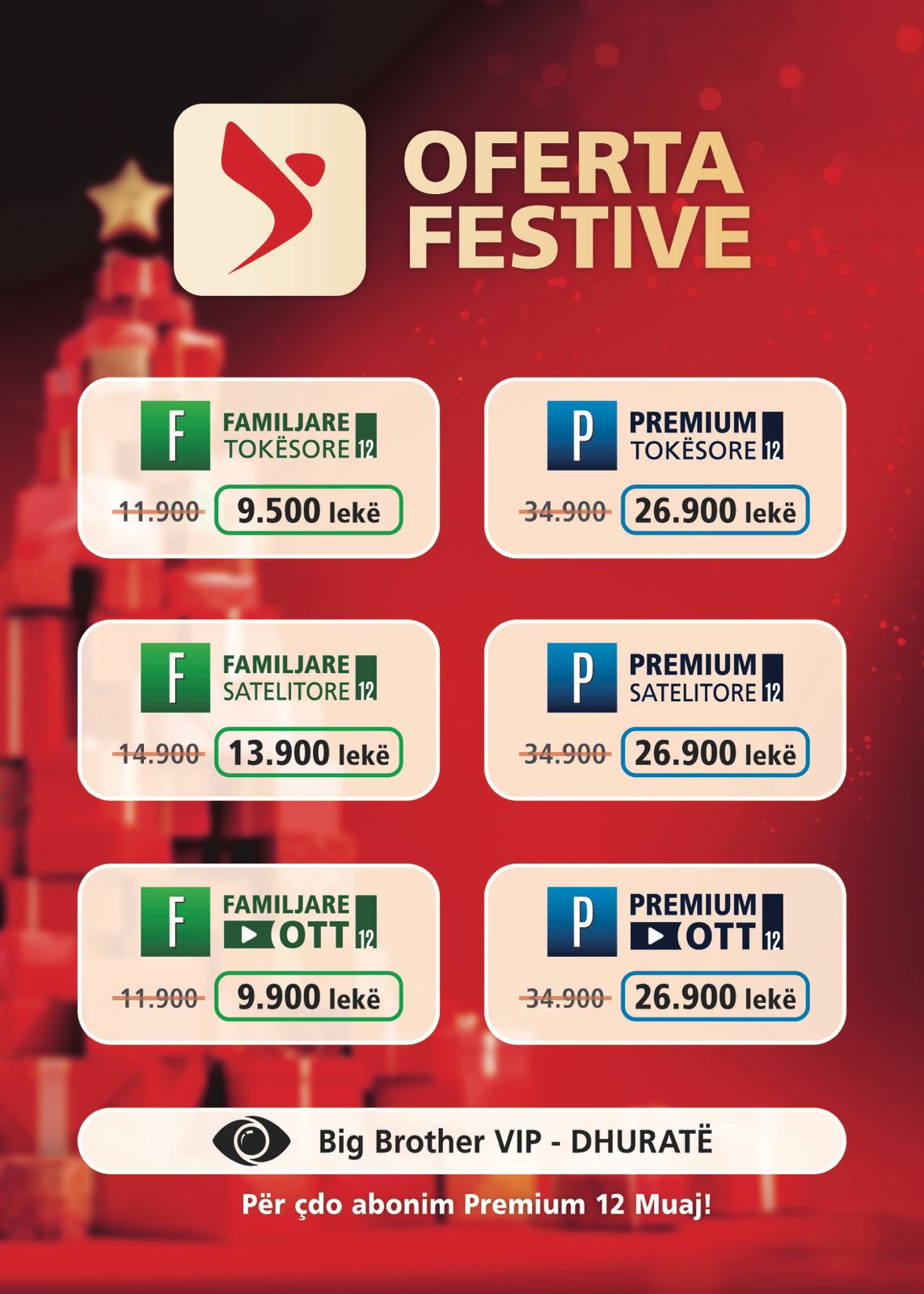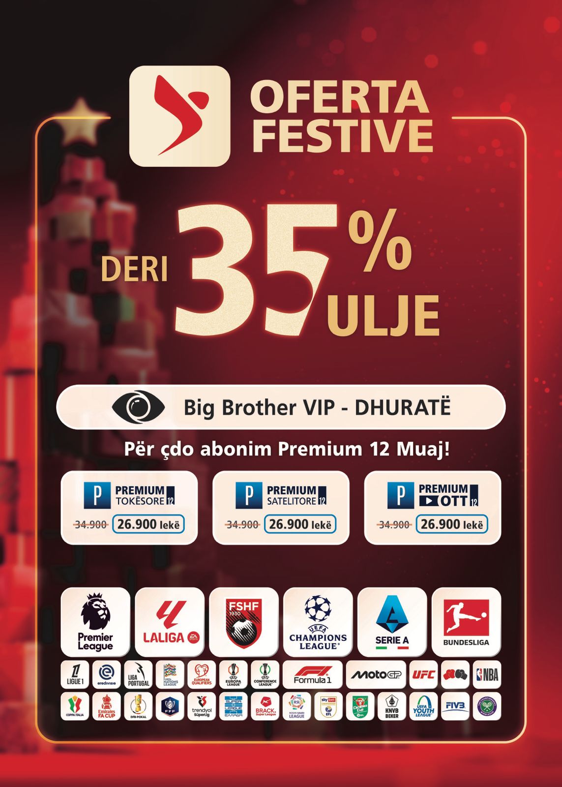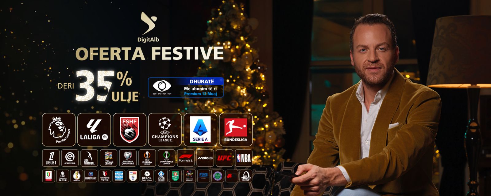 Kjo ofertë festive e DigitAlb vjen me ulje çmimi deri në 35%. Me çdo abonim të ri Premium 12-mujor, tashmë me të gjitha eventet sportive dhe kanalet e tjera familjare, merr dhuratë Big Brother VIP Albania.
