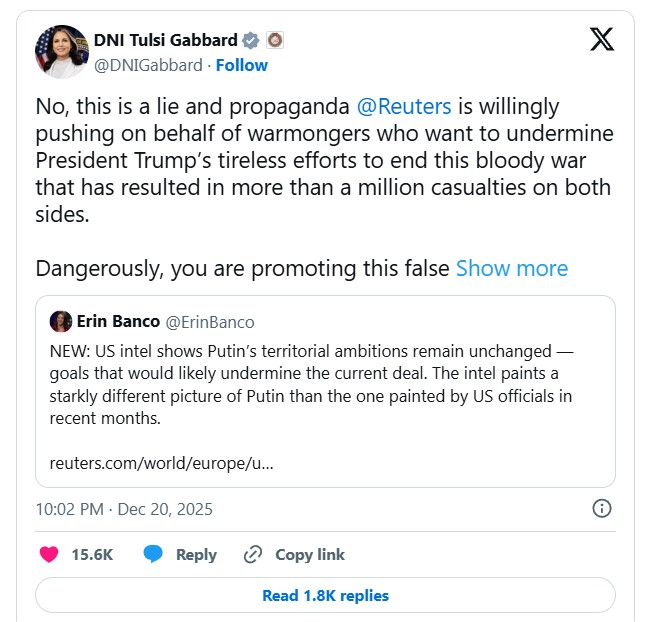“Jo, kjo është një gënjeshtër dhe propagandë që Reuters po e shtyn me dëshirë në emër të luftënxitësve që duan të minojnë përpjekjet e palodhura të Presidentit Trump për t’i dhënë fund kësaj lufte të përgjakshme që ka çuar në më shumë se një milion viktima në të dyja anët,” u përgjigj Gabbard në një postim në X.