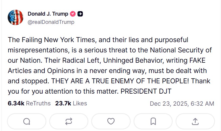 ” New York Times dështak, dhe gënjeshtrat e tyre dhe keqinformimet e qëllimshme, janë një kërcënim serioz për Sigurinë Kombëtare të Kombit tonë. Sjellja e tyre e Majtë Radikale, e Shfrenuar, duke shkruar Artikuj dhe Opinione TË RREME në një mënyrë të pandalshme, duhet të trajtohet dhe të ndalet. ATA JANË NJË ARMIK I VËRTETË I POPULLIT! Ju faleminderit për vëmendjen tuaj ndaj kësaj çështjeje. PRESIDENTI DJT” – shkruan Trump në rrjetin e tij social, Truth Social.
