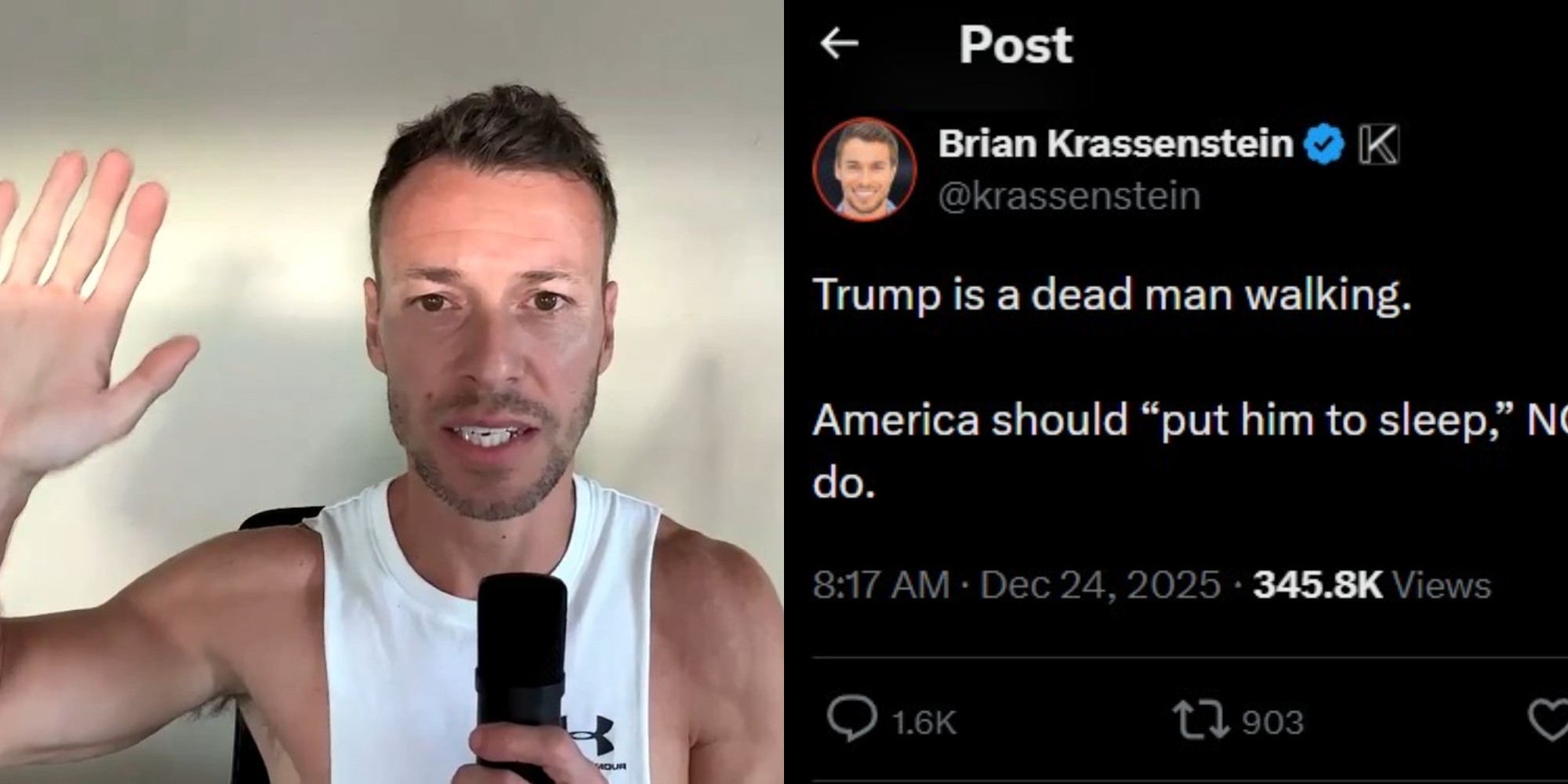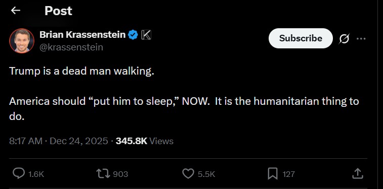 Komentatori dhe influenceri i majtë në SHBA, Brian Krassenstain, ka bërë thirrje për eliminimin e presidentit amerikan Donald Trump. Në një postim në X, ai shkruan: “Trump është i vdekur e i pakallur. Amerika “duhet ta heqë qafe”. Tani. Është gjëja humane për t’u bërë.”
