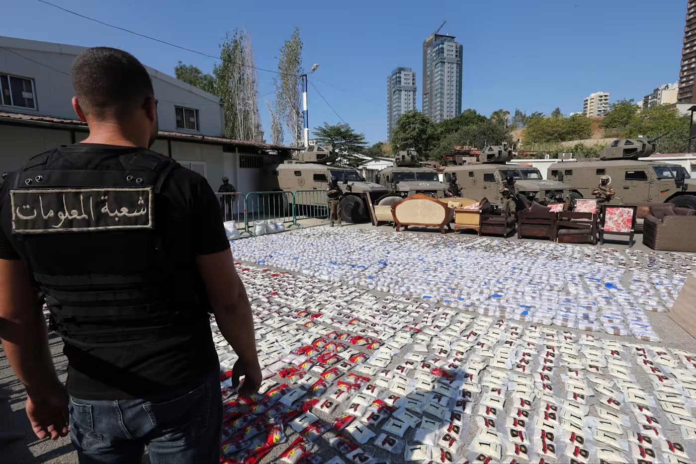 Një anëtar i Degës së Informacionit të Libanit qëndron pranë çantave me pilula të sekuestruara Captagon
