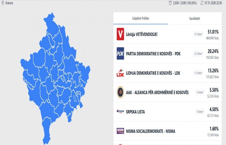 Rezultatet e publikuara tregojnë se Lëvizja Vetëvendosje ka dalë e para me 51.01 për qind të votave, duke siguruar 57 ulëse në Kuvend.