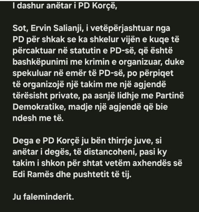 Dega e PD Korçë ju bën thirrje juve, si anëtar i degës, të distancoheni, pasi ky takim i shkon për shtat vetëm axhendës së Edi Ramës dhe pushtetit të tij.”