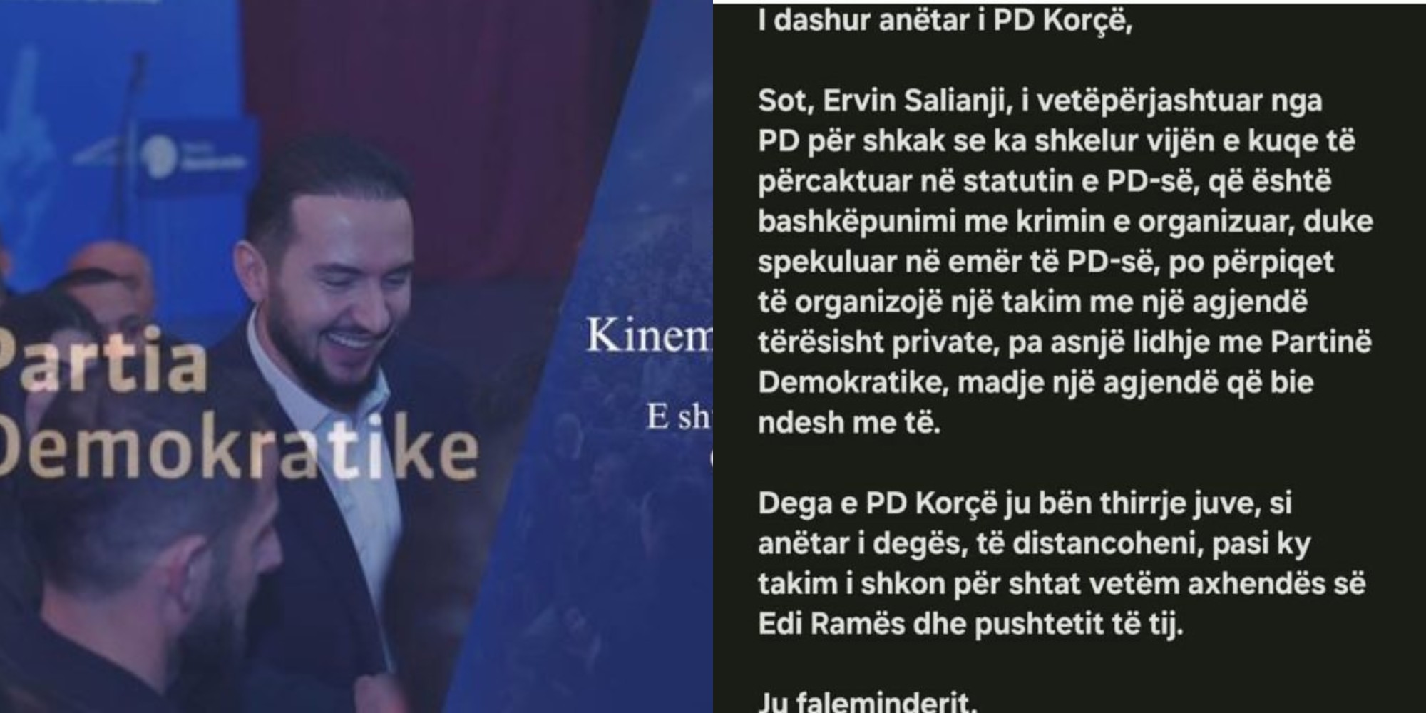 Sot, Ervin Salianji, i vetëpërjashtuar nga PD për shkak se ka shkelur vijën e kuqe të përcaktuar në statutin e PD-së, që është bashkëpunimi me krimin e organizuar, duke spekuluar në emër të PD-së, po përpiqet të organizojë një takim me një agjendë tërësisht private, pa asnjë lidhje me Partinë Demokratike, madje një agjendë që bie ndesh me të.