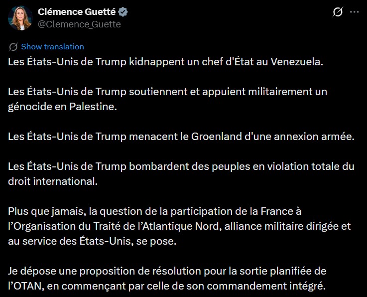 Nënkryetarja e parlamentit francez, Clémence Guetté, njoftoi se ka dorëzuar një propozim për tërheqjen e planifikuar të Francës nga NATO, duke shprehur pakënaqësi me politikat e presidentit të SHBA-së, Donald Trump.