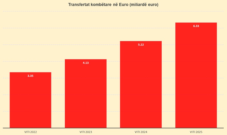 Transfertat në euro janë rritur me 22.7% krahasuar me vitin 2024. Në vlerë, transfertat për vitin e kaluar arritën në pothuajse 6.33 miliardë euro, me një rritje vjetore prej 21.3%.