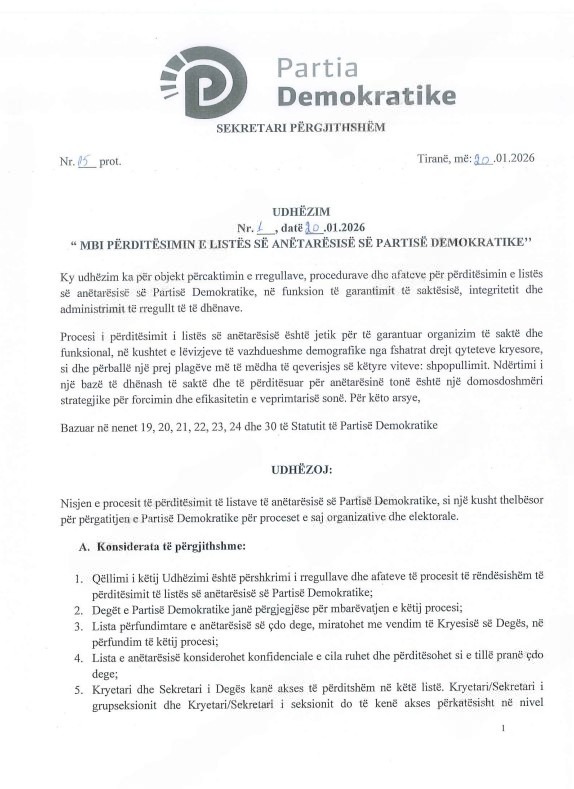 Masa ishte njoftuar pak ditë më parë nga kreu Berisha në një takim me demokratët e Lezhës. Përditësimi përfshin spastrimin e të gjithë atyre që sipas drejtuesve të PD-së kanë punuar kundër partisë në fushatat zgjedhore. Procesi duhet të përfundojë brenda 20 shkurtit 2026.