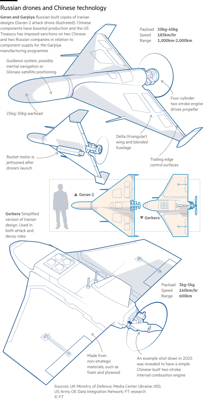Të dhënat nga fusha e betejës e përforcojnë këtë perceptim. Analizat e dronëve rusë të rrëzuar tregojnë se në vitin 2025 pjesët kineze kanë tejkaluar për herë të parë ato amerikane, me komponentët zviceranë në vendin e tretë. Ndërkohë, Rusia ka rritur ndjeshëm prodhimin e dronëve me rreze të gjatë, si Geran dhe Garpiya, të përdorur për sulme ndaj qyteteve ukrainase, duke u mbështetur në një kombinim të teknologjisë kineze dhe zinxhirëve alternativë të pagesave.