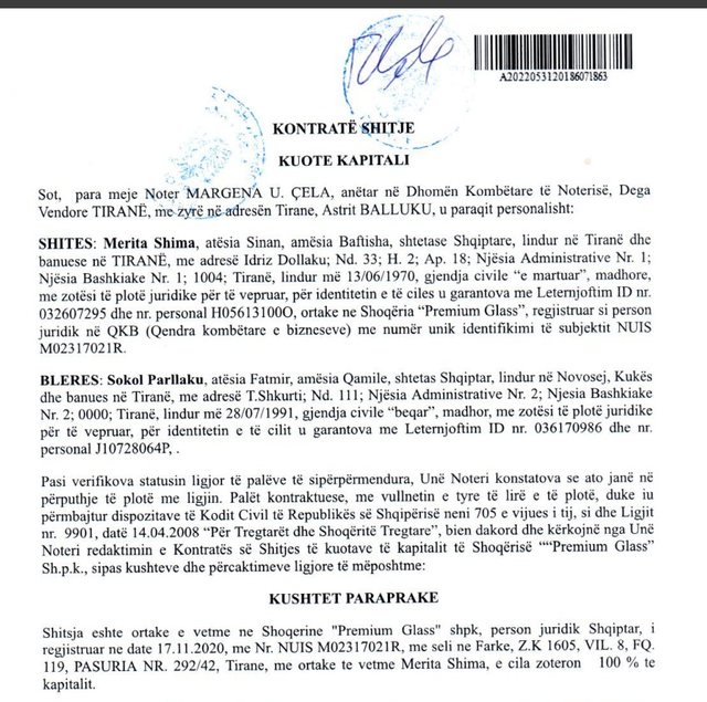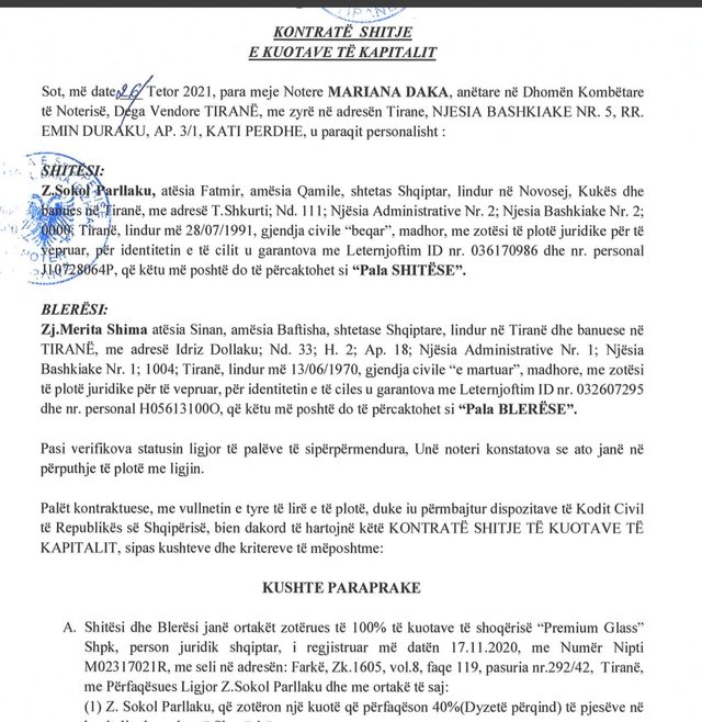 Faksimile: Kontrata e blerjes së kompanisë “Premium Glass” nga Merita Shima, nëna e Daniel Shimës