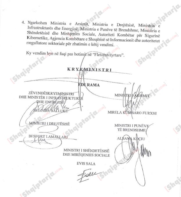- Ngarkohen Ministria e Arsimit, Ministria e Drejtësisë, Ministri lafrastrukturës dhe Energjisë, Ministria e Punëve të Brendshme. Ministria e Shëndetësisë dhe Mirëqenies Sociale, Autoriteti Kombëtar për Sigurinë Kibernetike, Agjencia Kombëtare e Shoqërisë së Informacionit dhe autoritetet rregullatore sektoriale për zbatimin e këtij vendimi.