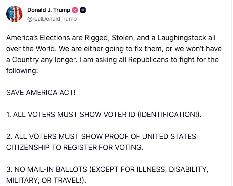“Zgjedhjet në Shtetet e Bashkuara janë manipuluar, janë vjedhur dhe janë kthyer në objekt talljeje në mbarë botën. Nëse nuk i ndreqim urgjentisht, rrezikojmë të mos kemi më një shtet funksional. Për këtë arsye, u bëj thirrje të gjithë republikanëve të luftojnë pa kompromis për këto masa thelbësore: