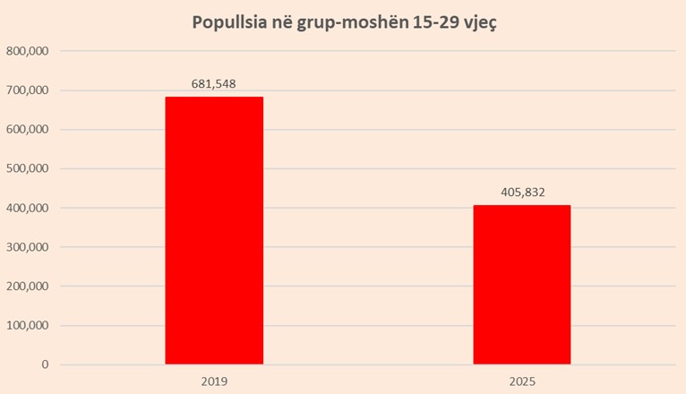 Numri i të rinjve të regjistruar si të papunë arriti në 15,717 persona në tremujorin e tretë të vitit 2025, nga 15,021 në të njëjtin tremujor të vitit 2019, ose 4,6% më shumë. Papunësia e qëndrueshme tek të rinjtë vjen në një kohë që popullsia në grup-moshën 15-29 vjeç e të rinjve ka pësuar një rënie të fortë, nga 681,548 persona në vitin 2019 në vetëm 405,832 në vitin 2025, me rënie 40.4%.